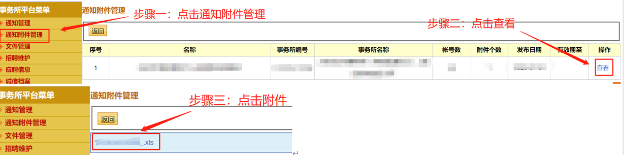 各事务所请登录协会内网,按下图点击“通知附件管理”查看相应通知,通过下载相应附件,即可获知本所参加面试人员名单。